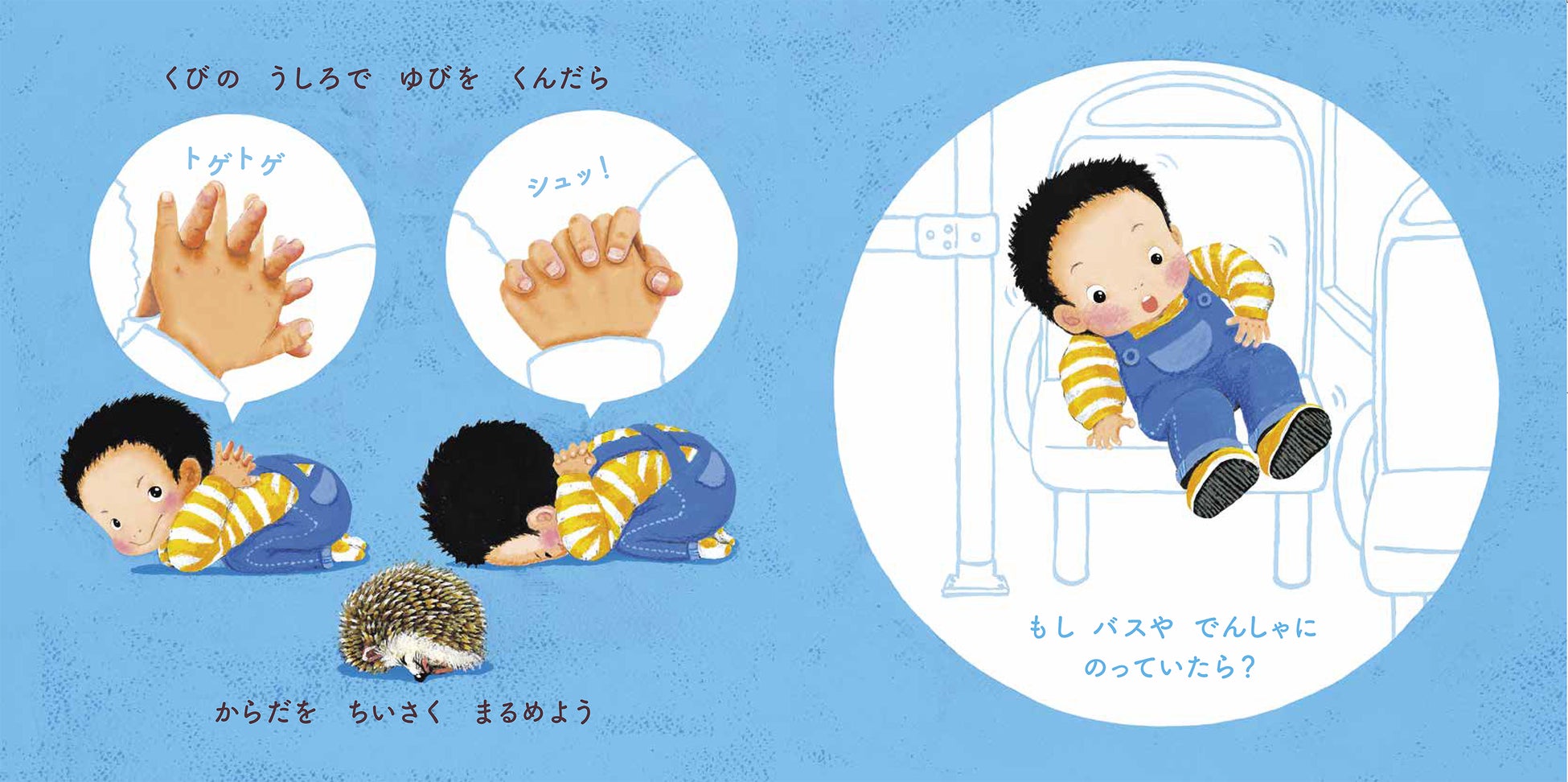 「大きくはっきりした分かりやすいイラストで、動物に親しみを感じながら身を守るポーズを練習できるところがいいなと思いました。たくさんの動物が出てくるので、低年齢から興味がもてると思います。」(保育士)