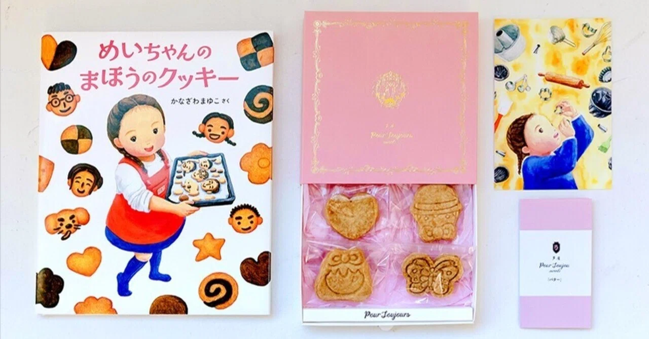 物語の中で、主人公のめいちゃんが心を込めて焼く「まほうのクッキー」。 今回のギフトセットには、そのモデルとなった梶本莉佐さんの優しいお菓子と、私の絵本が大切に詰め合わされています。